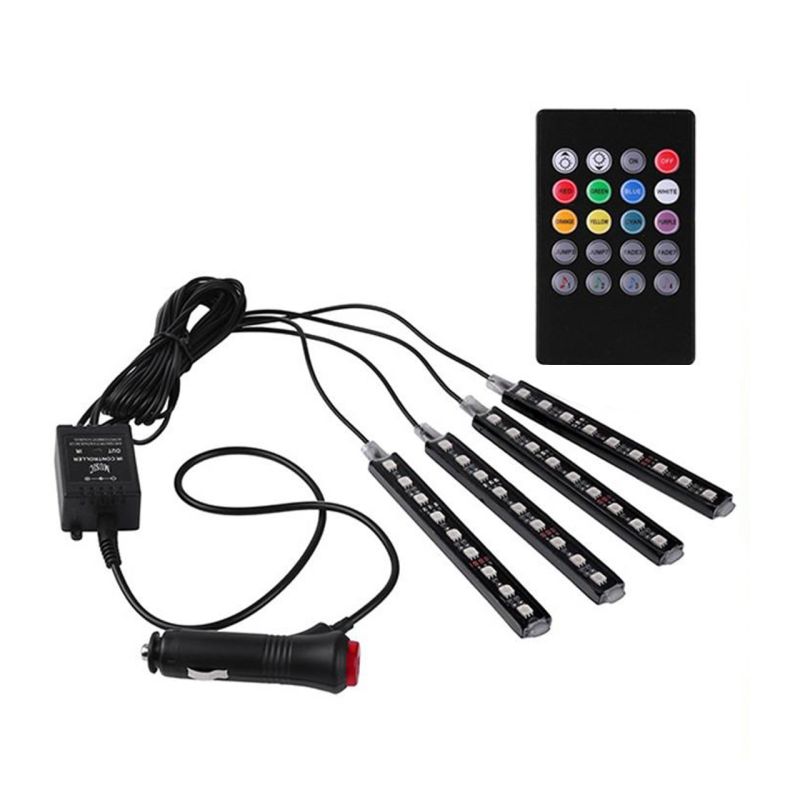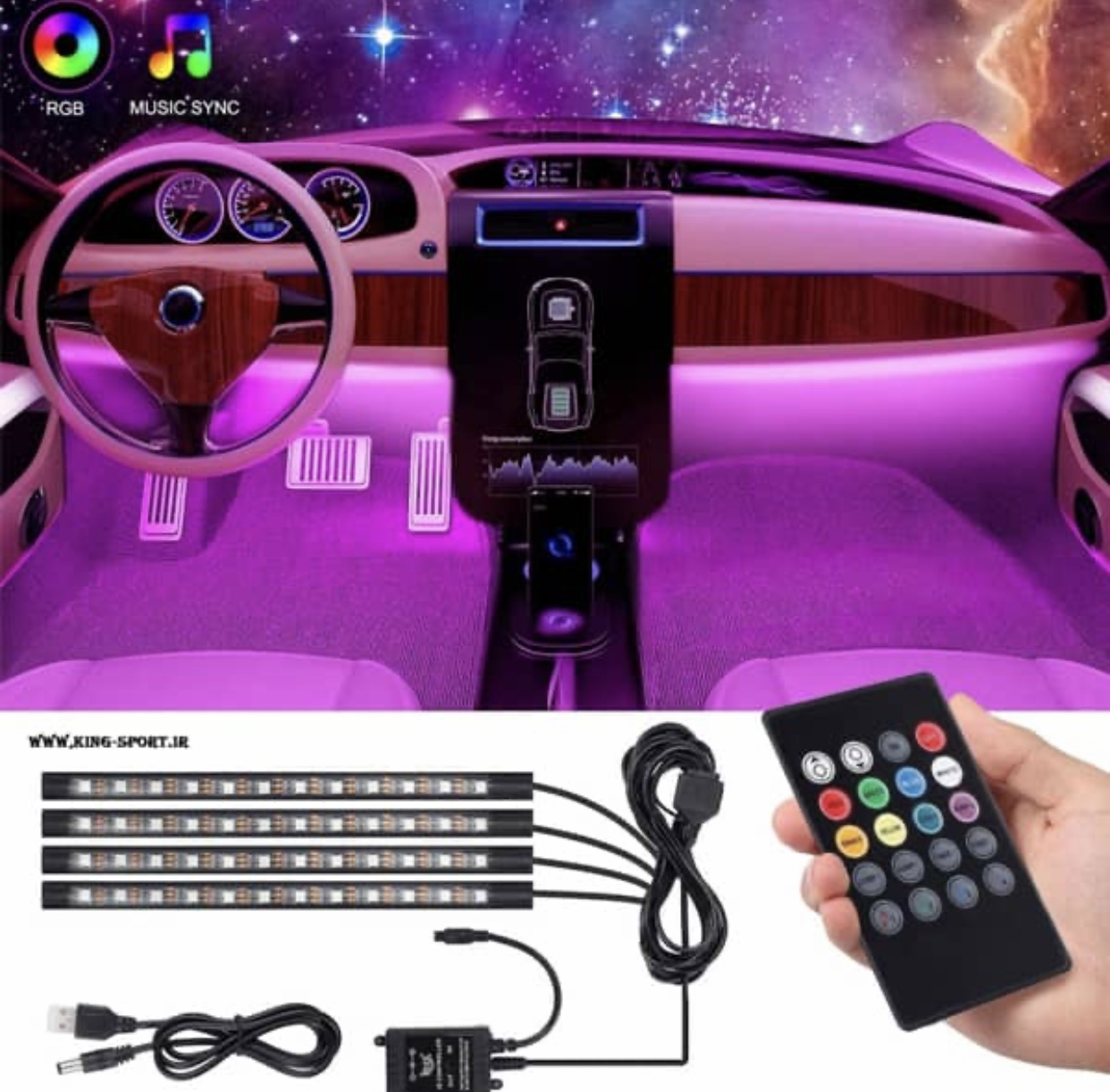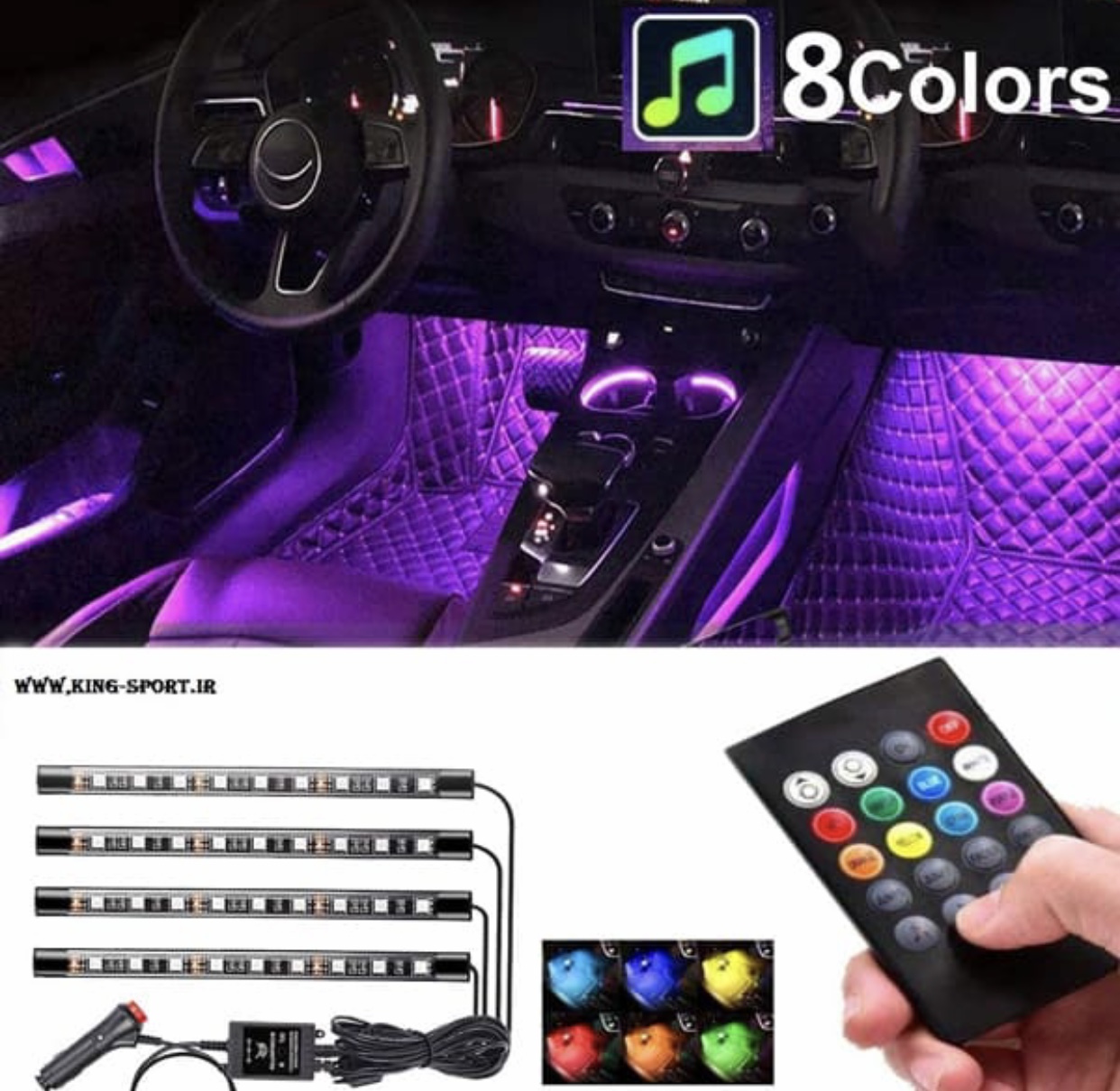 ویژگی های محصول:••۴ دسته ال ای دی 12 تایی هفت رنگ•• ضد آب و انعطاف پذیر••امکان کم و زیاد کردن نور••دارای حالت های مختلف نوردهی••دارای رقص نور موزیکال••دارای ریموت کنترل••دارای سنسور صدا••با ولتاژ ۱۲۷••طول هر ال ای دی:۱۲سانتی متر••ضد آب.این لایت ها در زیر داشبورد و صندلی های جلو نصب میشوند و با ریموت قابل تنظیم هستند.